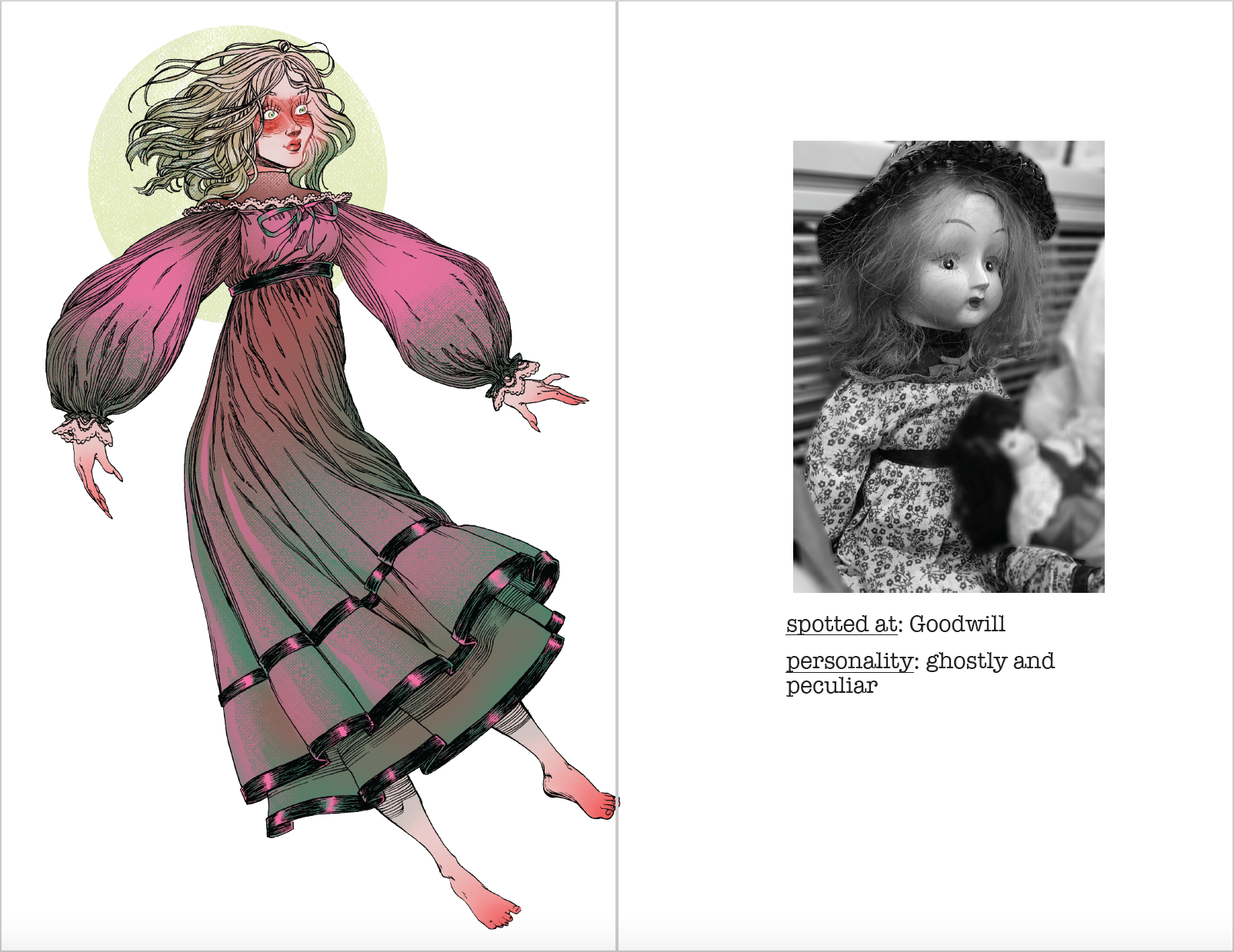 A series of seven illustrations based on dolls found in various locations, accompanied by imagined personalities.